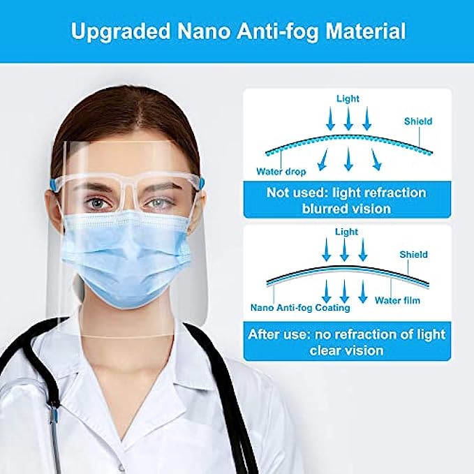 • 【Ultra Clear and Anti-fog Visor】This Face shields with Glasses frames could provide super clear visibility and will not collect water vapor and be cloudy when breathing. Special Anti-fog coating is put on both side of the shield for use in different ascensions. The shield is super clear, after peeling off LAYERS OF PROTECTIVE FILMS ON BOTH SIDE OF THE SHIELD. Environmentally Reusable after disinfecting. Some assembly required.