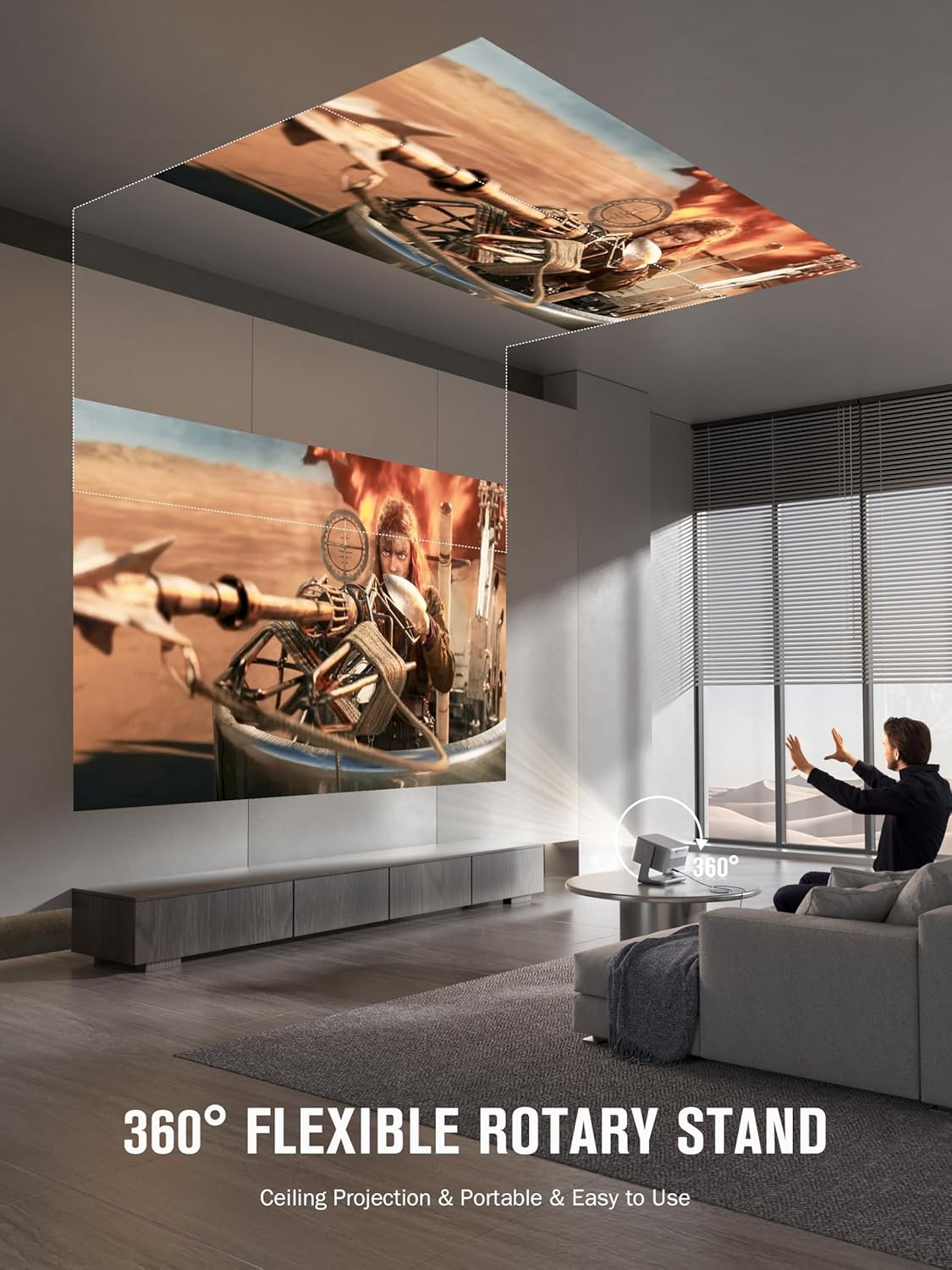 【360°可调节支架:灵活旋转】 ——这款卧室投影仪配备360°旋转支架,可轻松将图像投射到天花板、墙壁或帐篷上,带来无与伦比的观看体验。无论您喜欢坐着还是躺着观看,这款蓝牙投影仪都能满足您的所有需求,如同您生活中的镜头,始终锁定最佳角度。[WiFi 6 & Bluetooth 5.2: Seamless Sync] – WiFi 6 ensures stable and fast signal transmission, providing seamless wireless screen mirroring via WiFi and Bluetooth for ultra-smooth movies and gaming sessions. Built-in Bluetooth 5.2 technology enables seamless audio synchronization, instantly turning your WiFi projector into a high-quality Bluetooth speaker. Play your favorite playlists and enjoy perfectly synchronized sound. Sit back — the immersive experience is about to begin.