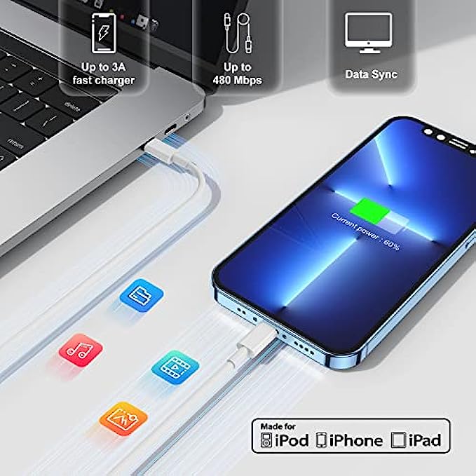 • ?【20W Fast Charging&Syncing 】Charging iPhone 13 12 from 0% to 70% in just 30 mins.PD 3.0 Quick-Charge USB C charger with 10ft type c to lightning cable saves more than 1 hour for you when compared to the 5W original charger.It also support the fast data transfer rates up to 480Mbps.Enjoy your faster charging and data transfering.