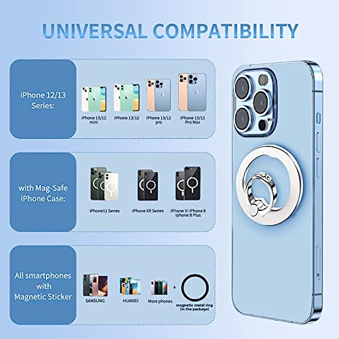 • ?【Two Ways of Use】For magsafe phone ring holder,it is designed for iPhone 13/12 series.For iPhone 13/12 series,move magnetic phone finger holder to the back of your compatible with MagSafe case.Auto-align in an instant! For other models phone,attach the metal ring (in the package) to the back of your phone case if you use case.Then stuck the finger phone ring on the metal ring, which is suitable for most smartphones.