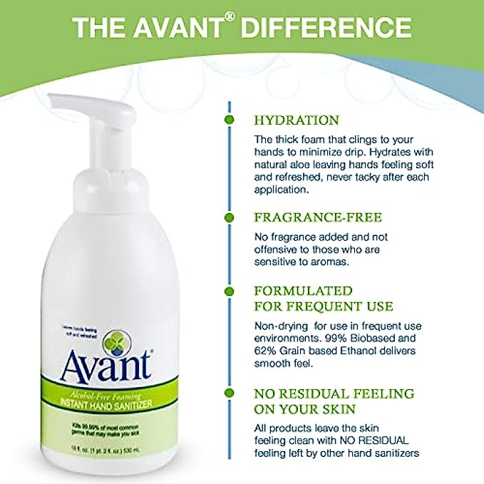 • ALCOHOL-FREE: Avant Alcohol-Free foaming instant hand sanitizer kills 99.99% of most common germs. The bio-based, fragrance-free formulation is powered by Benzalkonium Chloride, a safe and effective antiseptic.