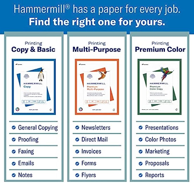 • OTHER PAPER OPTIONS – Scroll down to compare Hammermill print and copy paper for every purpose including premium presentation-quality color copy paper, cover-weight paper stock, and glossy paper for photo printing