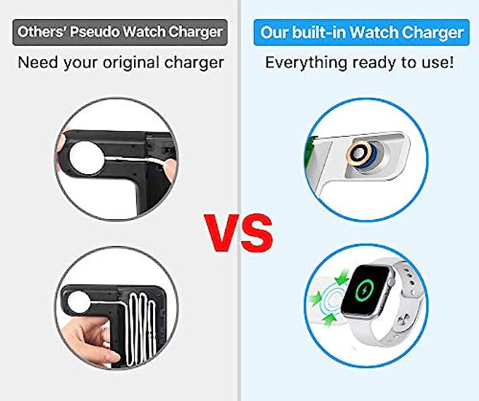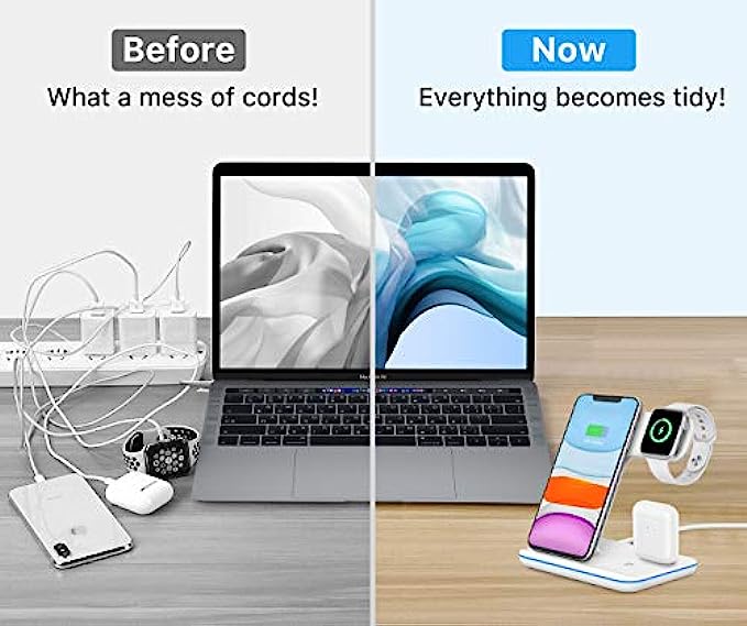 • 【Latest upgrade】Upgraded design and internal chip ensure safe and fast wireless charging. One charging device for iPhone, iWatch, and Airpods/Pro. Suitable for home and office usage.