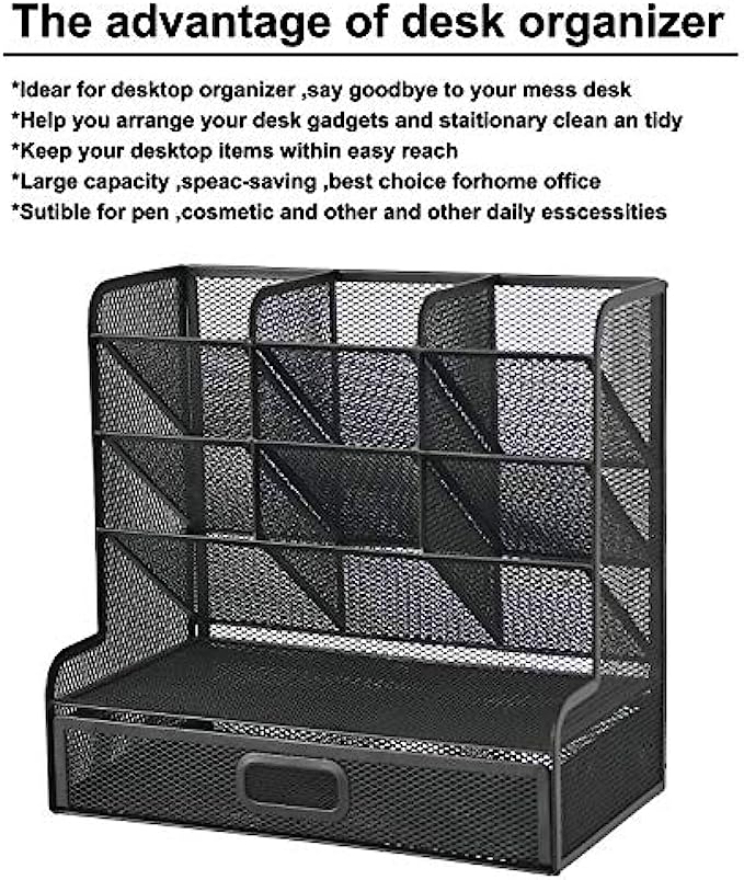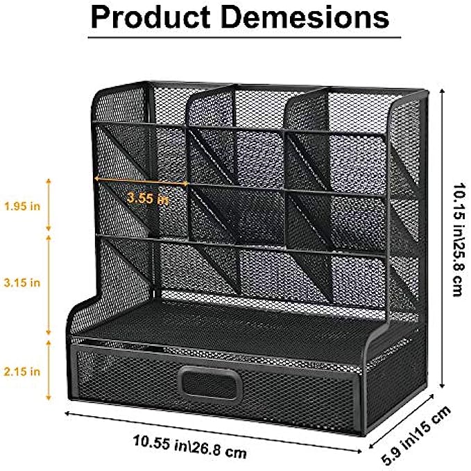 • ✏️【ULTRA-LARGE CAPACITY】: Set of 9 compartments with a rack, enough compartments to allow for some basic organization. It's designed a drawer to store a wide variety of items. , multifunction help you arrange the desk gadgets and stationary clean and tidy.The best and safest storage option for you. Perfect Size:10.5*5.9*10.1inch.