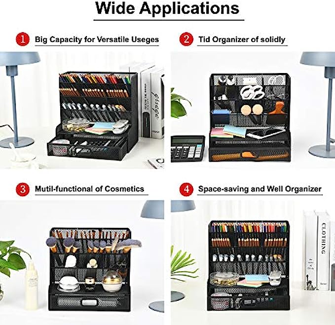 • ✏️【VERSATILE DESIGN】: This Desk Caddy is not only perfect for storing your desktop stationery such as pen, pencil, markers, ruler, eraser, paper clip, scissors, letter openers and and many other desk widgets but also great for storing your makeup brushes, nail polishes, lipsticks and other small personal items sorted by type, which makes it way easier to find what you need! and You can put any other daily necessities on the organizer,It helps you keep your stuff organized.