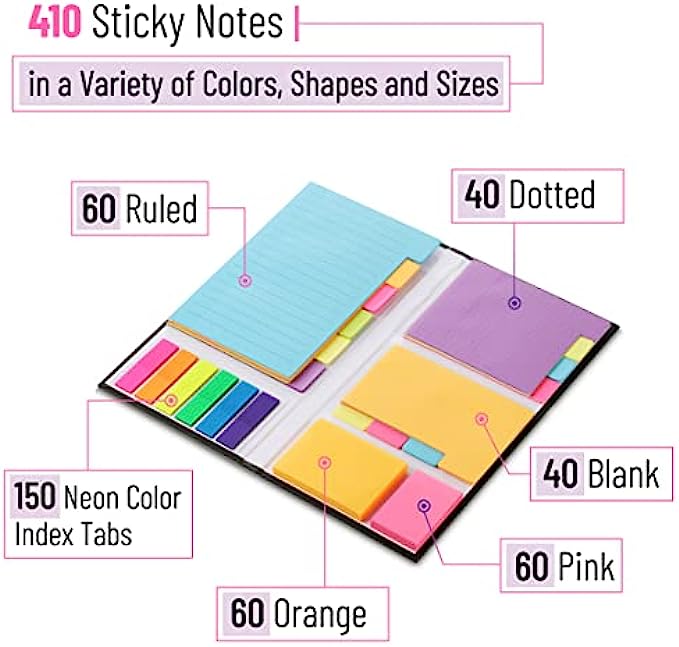 • Each sticky notes set includes 60 Ruled (3.8x6’’), 40 Dotted Notes (3x3.8’’), 40 Blank (2.6x3.5’’), 60 Orange and Pink, 150 Neon Color Index Tabs, 410 Total Tab Divider Notes