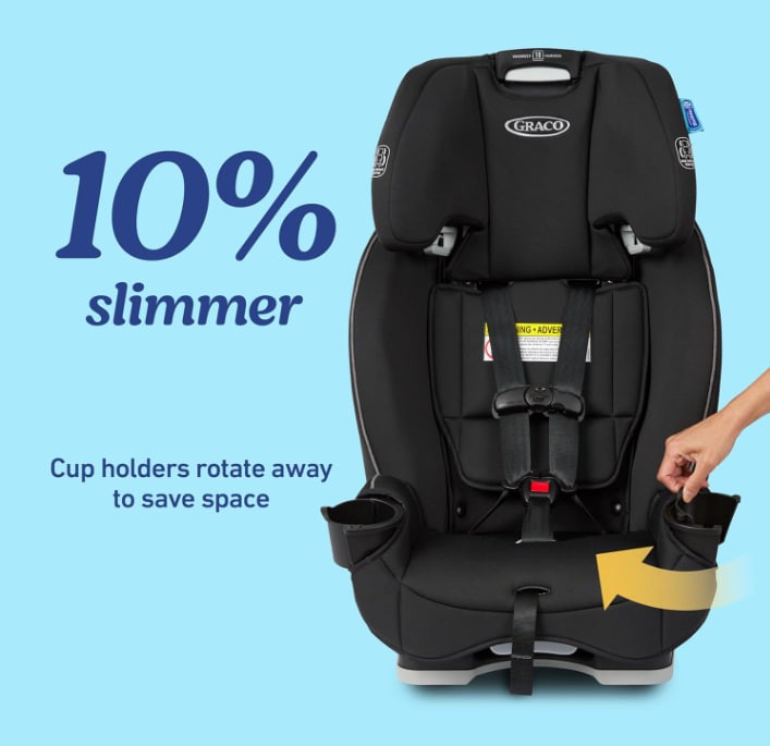Slim design with dual integrated cup holders that rotate away, making the seat 10% slimmer to save valuable back seat space