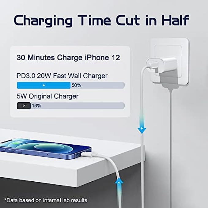 • PD 3.0 Fast Charging : PD 3.0 20W USB-C charger with 6ft type c to lightning cord, charges iPhone 12 up to 50% in just 30 minutes, which saves more than 1 hour for you, when compared to the 5W original charger.