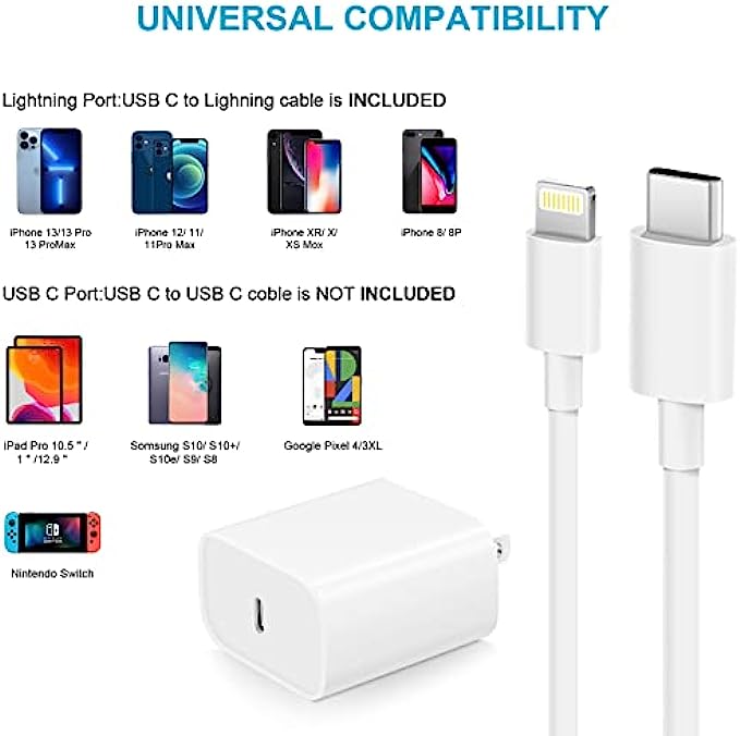 • 【Applicable Apple Equipment】 Use the official iPhone lightning cable with INCORIC 20W USB C wall charger to access fast-charging for iPhone 13/13 Mini/13 Pro/13 Pro Max/12/12 Mini/12 Pro/12 Pro Max/SE 2020/11/11 Pro/11 Pro Max/XS/XS Max/XR/X 8 Plus, iPad,iPad Pro iPad mini iPad Air.This INCORIC Power Delivery 3.0 Fast charger also charge for iPhone 7 6 Plus, iPhone 5 5c 5s SE Airpod in a original charging speed.