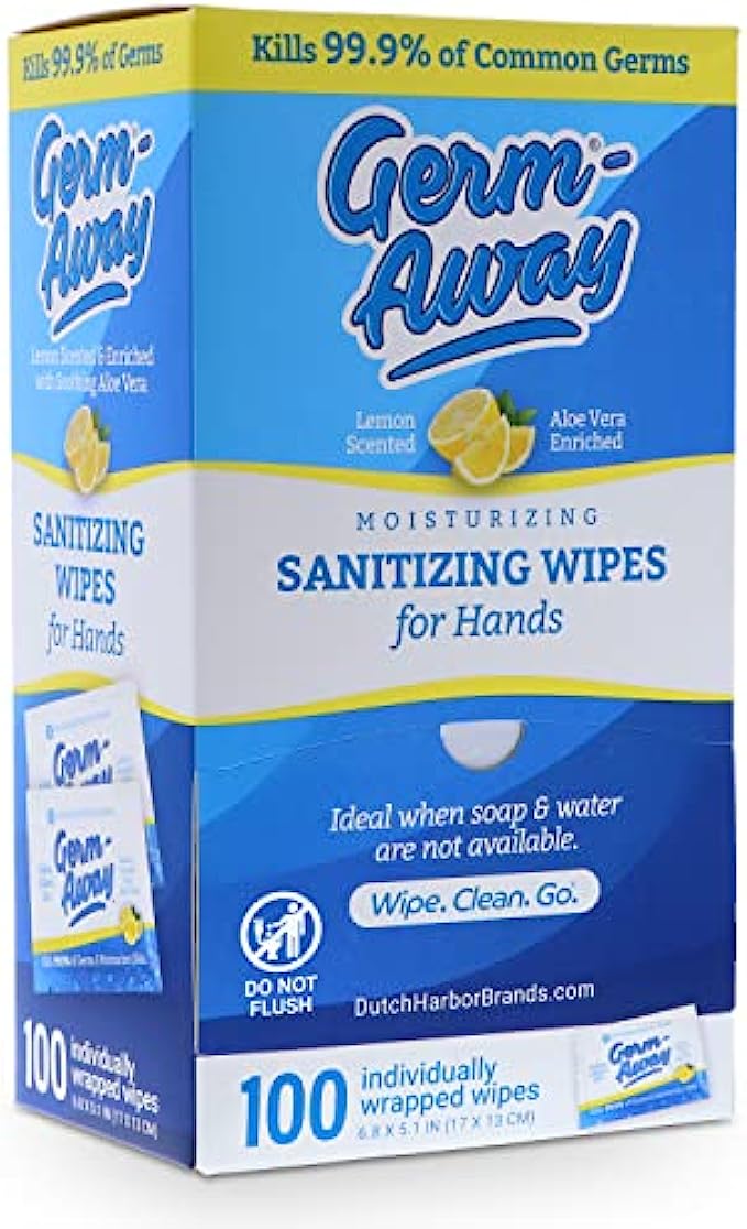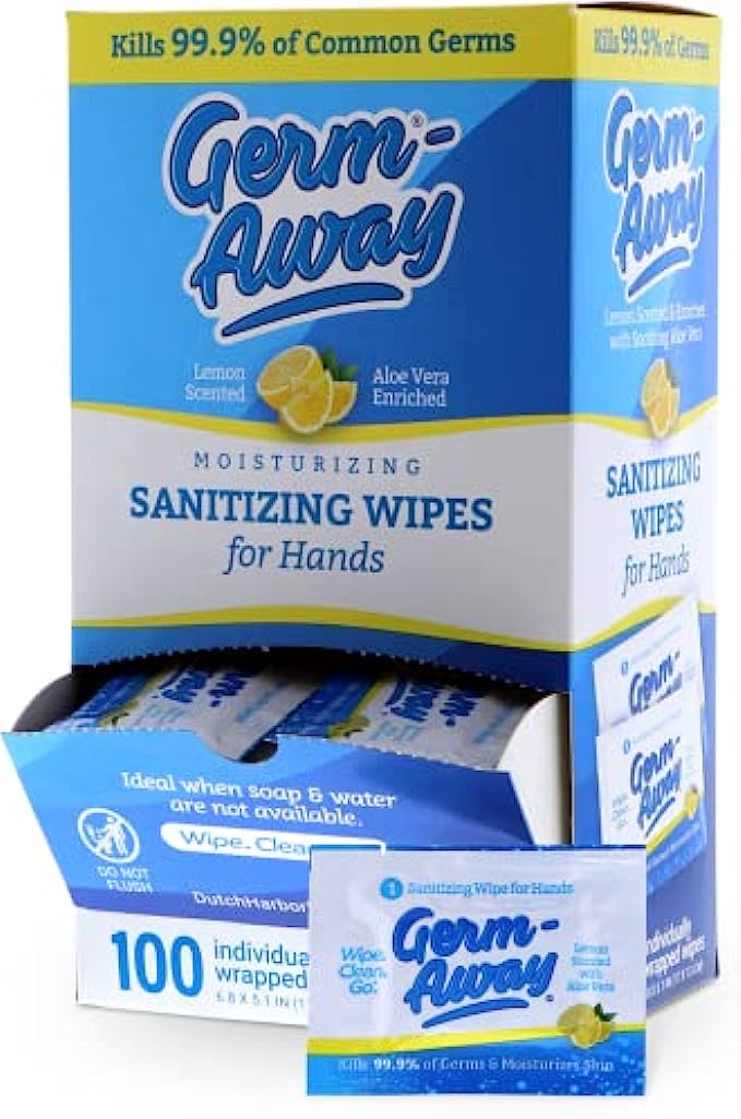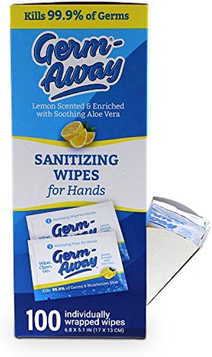 Germ-Away Large Antibacterial Hand Wipes Individually Wrapped Wipes, Travel Size Hand Sanitzer Wipes with Aloe in Dispenser Box, 100 ct Lemon Scent