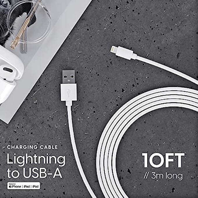 • iPhone lightning charger cable is a 10' long cord that provides a max-speed fast charge from USB wall charger adapter or portable charger to your iPhone, iPad Air, Pro, or iPad Mini