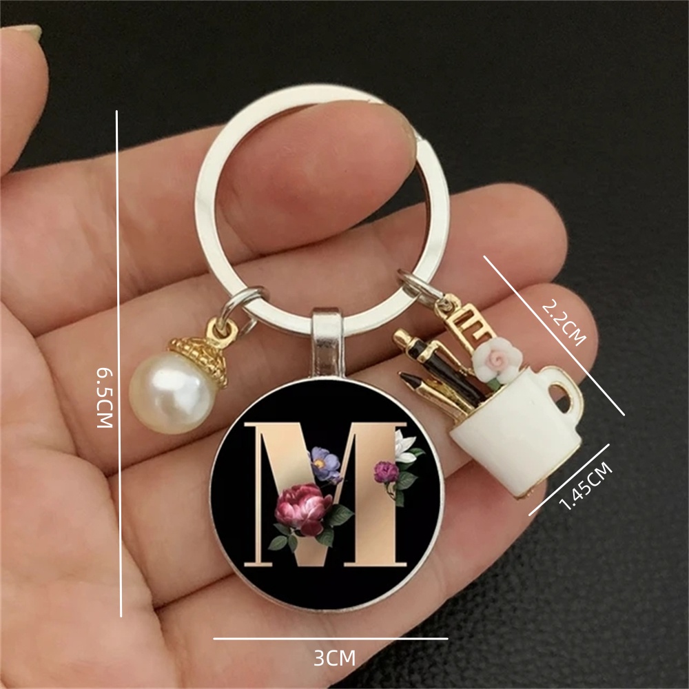 Elegant Imitation Pearl Key Chain Charm Enamel Pen Holder 26 Letters Key Ring for Teacher's Day Gifts Women Bag Ornaments