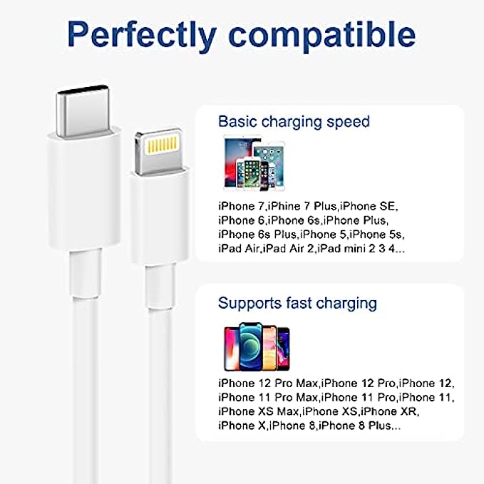 【Wide Compatibility】- USB C to Lightning Cable Perfectly compatible with iPhone 13/ 13 Mini/ 13 Pro/ 13 Pro Max/ iPhone 12/ 12 Mini/ 12 Pro/ 12 Pro Max/ 11/ 11 Pro/ 11 Pro Max/ iPhone XS / XS Max / iPhone X/ XR/ iPhone 8/ 8 Plus/ iPhone 7 / 7 Plus/ iPhone 6/ 6s / 6 Plus /6s Plus/ iPhone 5s / 5c / 5 / SE, iPad, iPod