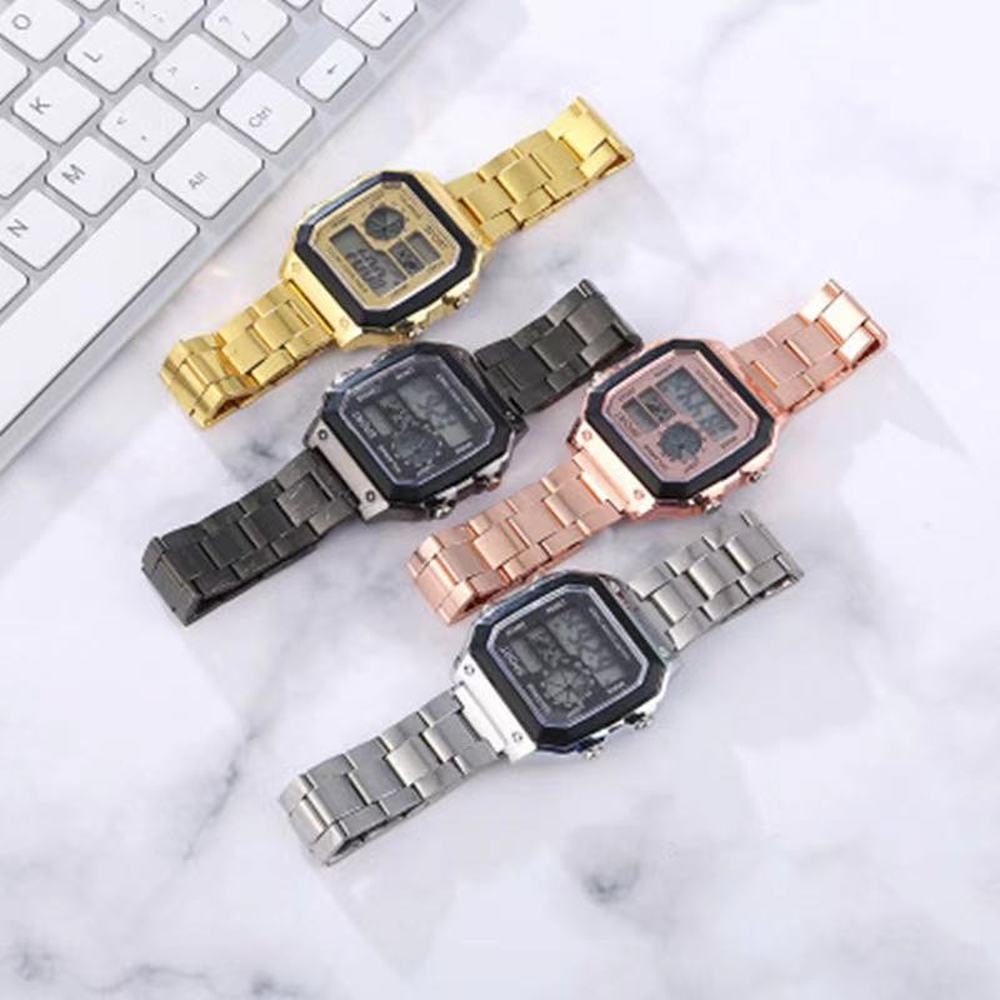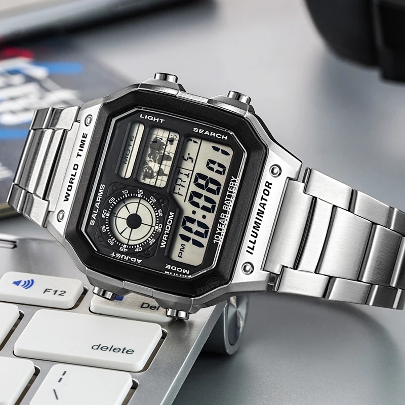 Men Watches Waterproof LCD Colorful Cold Light Watch Stainless Steel Digital Watch 5 Alarm Clock World Time Fashion Watches