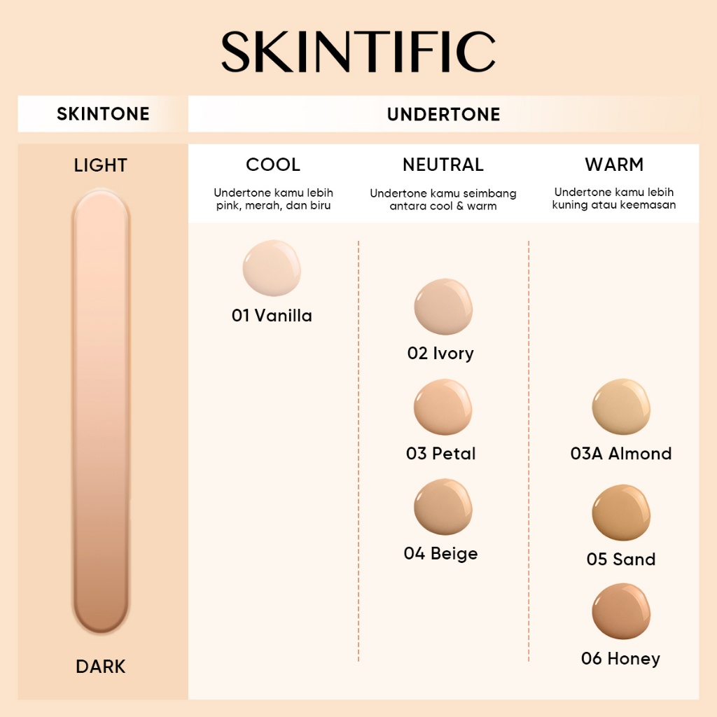 Suitability:Came back to get the right shade Performance:Not tested Formulation:Creamy, lightweight and hydrating. Dries down semi matte & doesn't feel tacky. Had to repurchase in the shade 03 Petal as I previously got 04 Beige and it was too dark for me. I initially got 04 Beige as I wasn't sure if 03 Petal was gonna be too light for me. Luckily I could just order the refill & replace it, I'm glad that they sell the refill separately as its more convenient especially if you purchased the wrong shade like me. Its also more sustainable since you don't need to replace the compact and just need to buy a new refill when the product runs out. Both shades 03 and 04 were claimed to be neutral shades by Skintific. I'm hoping that once it oxidises it'll be the right shade to match my skin tone. I usually wear Maybelline 220 Natural Beige. If you're the same shade, definitely get 03 Petal. I got the refill on sale for $12 which was a steal. Definitely recommend waiting for the sale periods like 8.8 when I purchased it. Definitely would advise to find out your undertone (warm, cool or neutral) and then refer to the shade guide provided by Skintific (I've uploaded it for reference). You can go online to find guides on how to find your skin undertone, then once you've found out your undertone then find the shade that matches your skin tone. Make sure to get 1 shade lighter than what would be your skin tone so that it oxidises to the right shade for you. And definitely look out for swatches online to see what all the shades look like on different skin colors. Hope it helps! ?